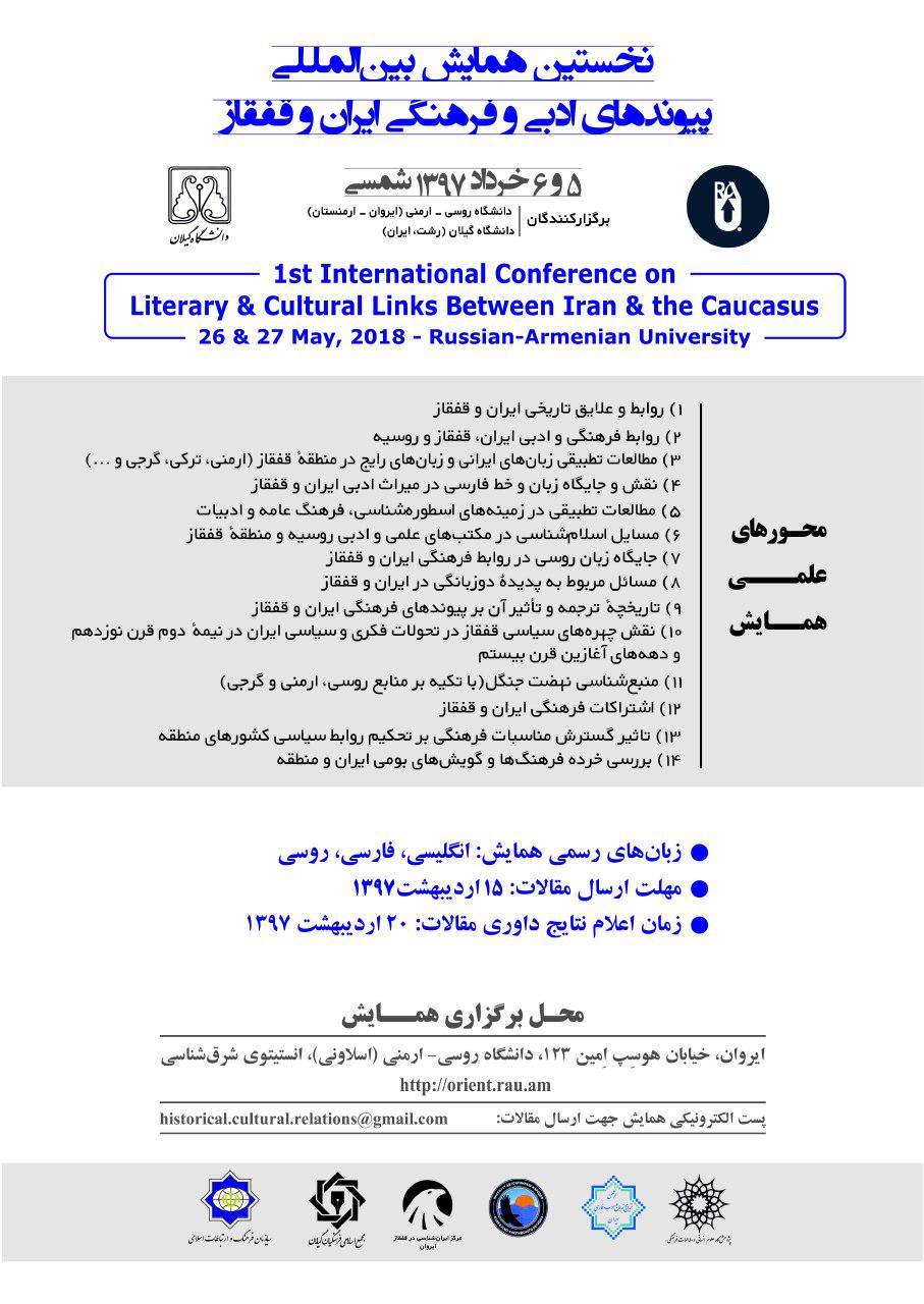 نخستین کنفرانس بین المللی پیوندهای ادبی و فرهنگی ایران و قفقاز در تاریخ 5 و 6 خرداد ماه در دانشگاه روسی ارمنd اسلاوانی در شهر ایروان برگزار می شود. علاقه مندان برای ارایه مقاله و آگاهی از محورهای آن به پوستر کنفرانس یا پایگاه www.orient.rau.am مراجعه نمایند.